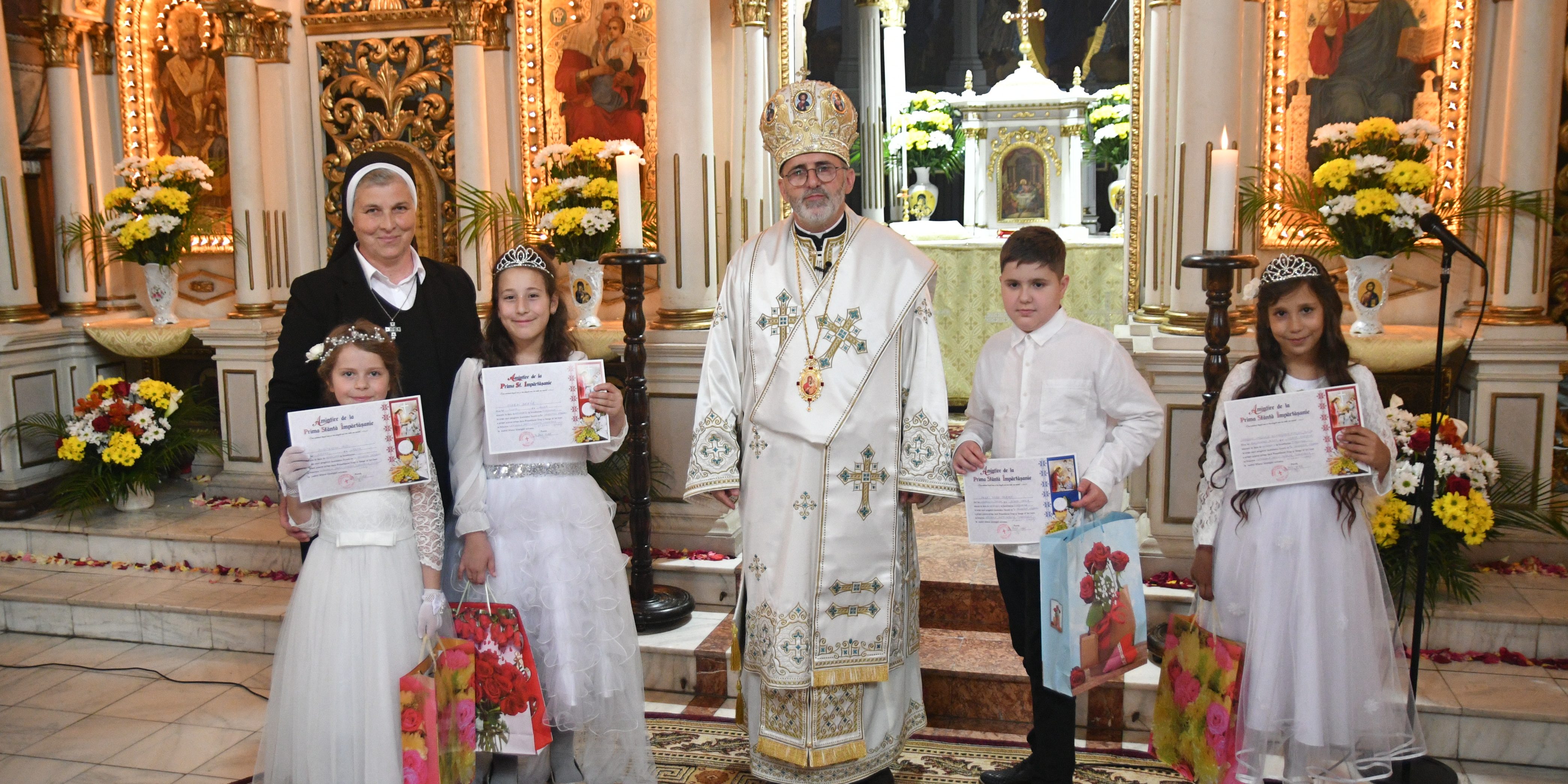 În semn de amintire, Preasfinţitul le-a înmânat copiilor câte o diplomă, „amintire de la Prima Sfântă Împărtăşanie” şi câte un cadou.