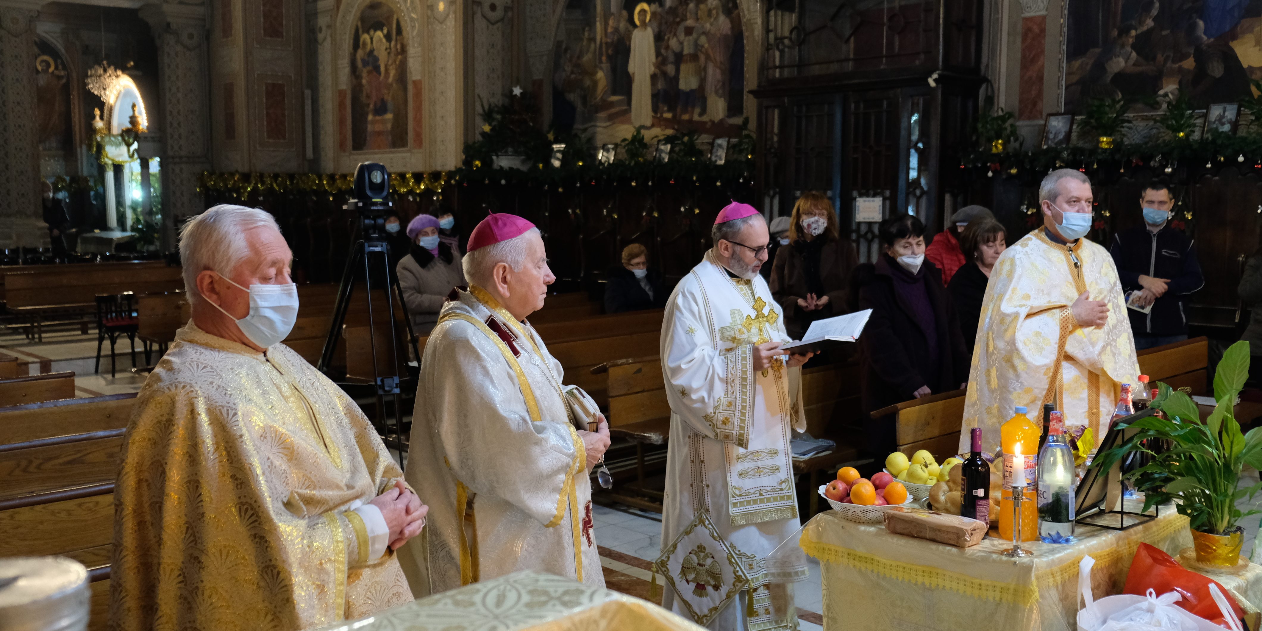 La Sfânta Liturghie arhierească din seara zilei de 12 ianuarie 2022, alături de Preasfinţiile Lor: Ioan Călin Bot, Episcop auxiliar de Lugoj şi Alexandru Mesian, Episcop de Lugoj, au concelebrat: Părintele Teodor Baba, Consilier Eparhial şi Protopop de Lugoj şi Părintele Prot. On. Ioan Pop, parohul catedralei. Răspunsurile la Sfânta Liturghie au fost date de Surorile Baziliene împreună cu un grup restrâns al Corului catedralei, dirijat de dna prof. Olimpia Drăgan.